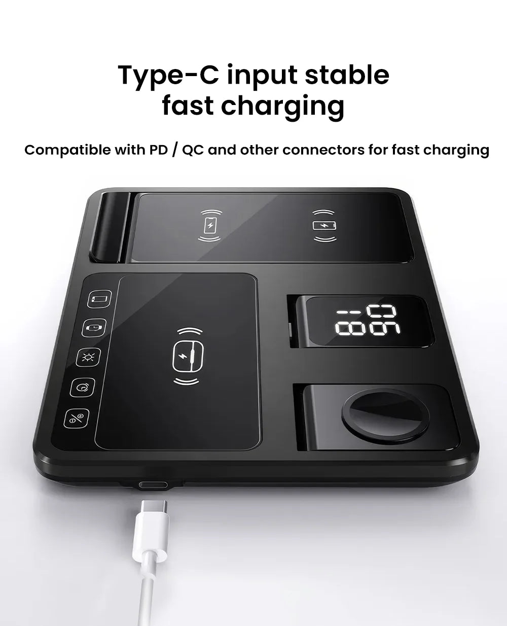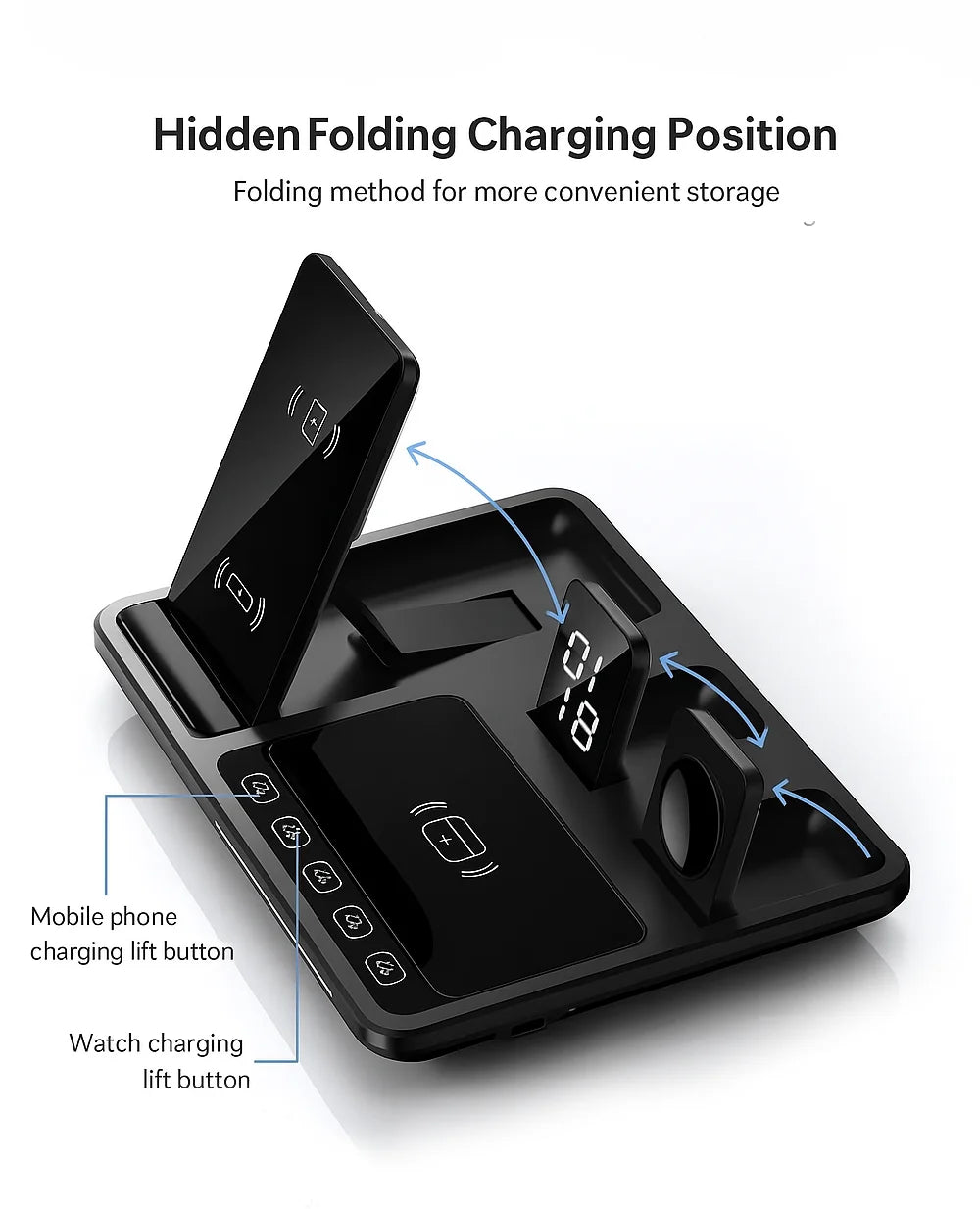 This 4-in-1 wireless charging station not only simplifies the charging process for multiple devices but also enhances your workspace or bedside table with its integrated clock and LED night light features. The automatic lift mechanism adds a touch of convenience, and the adjustable clock timing caters to individual preferences. With a focus on efficiency and user-friendly design, this charging station is a practical and stylish solution for your charging needs.